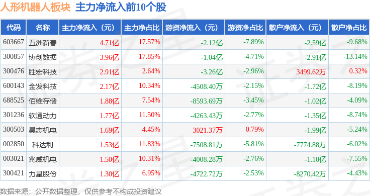 从资金流向上来看,当日人形机器人板块主力资金净流入7.15亿元,游资资金净流出14.24亿元,散户资金净流入7.09亿元。人形机器人板块个股资金流向见下表: