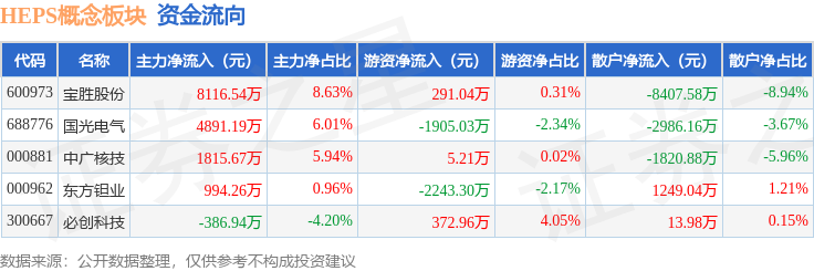 从资金流向上来看,当日HEPS概念板块主力资金净流入1.54亿元,游资资金净流出3479.12万元,散户资金净流出1.2亿元。HEPS概念板块个股资金流向见下表: