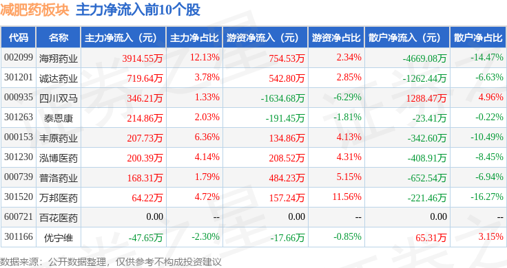 从资金流向上来看,当日减肥药板块主力资金净流出11.33亿元,游资资金净流入3.56亿元,散户资金净流入7.78亿元。减肥药板块个股资金流向见下表: