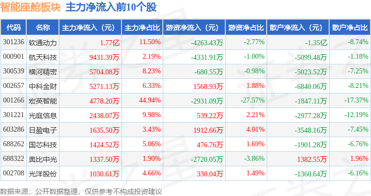从资金流向上来看,当日智能座舱板块主力资金净流出17.73亿元,游资资金净流入3.47亿元,散户资金净流入14.26亿元。智能座舱板块个股资金流向见下表: