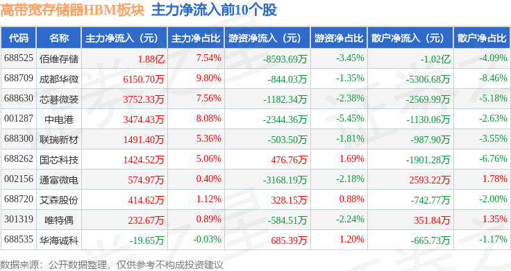 从资金流向上来看,当日高带宽存储器HBM板块主力资金净流出10.31亿元,游资资金净流入1.4亿元,散户资金净流入8.92亿元。高带宽存储器HBM板块个股资金流向见下表: