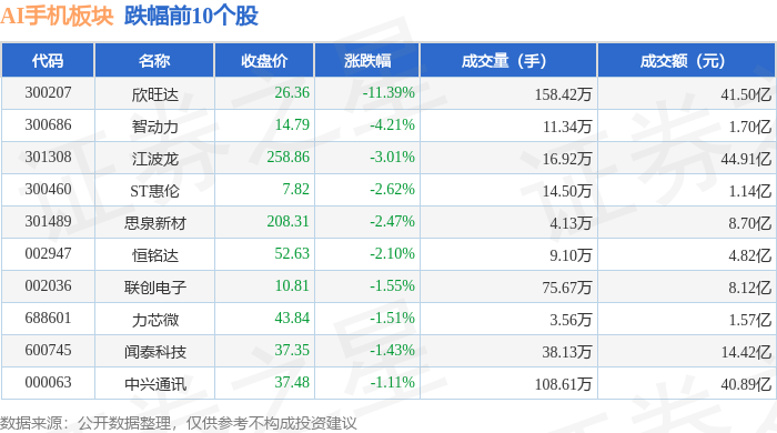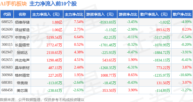 从资金流向上来看,当日AI手机板块主力资金净流出18.19亿元,游资资金净流入2.38亿元,散户资金净流入15.82亿元。AI手机板块个股资金流向见下表: