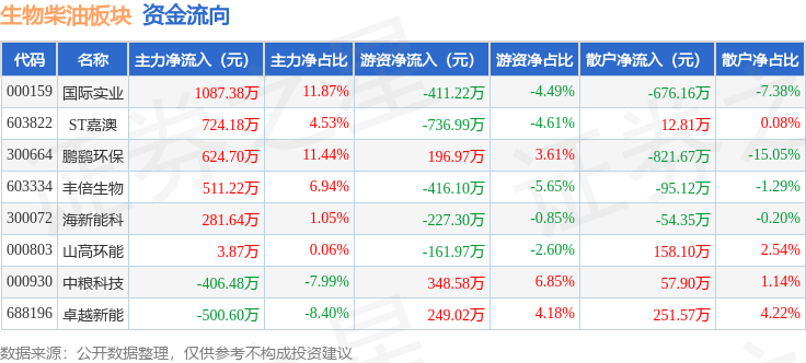 从资金流向上来看,当日生物柴油板块主力资金净流入2325.92万元,游资资金净流出1159.0万元,散户资金净流出1166.92万元。生物柴油板块个股资金流向见下表: