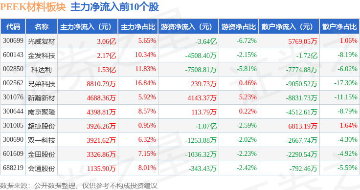 从资金流向上来看,当日PEEK材料板块主力资金净流出1.39亿元,游资资金净流出3.47亿元,散户资金净流入4.86亿元。PEEK材料板块个股资金流向见下表:
