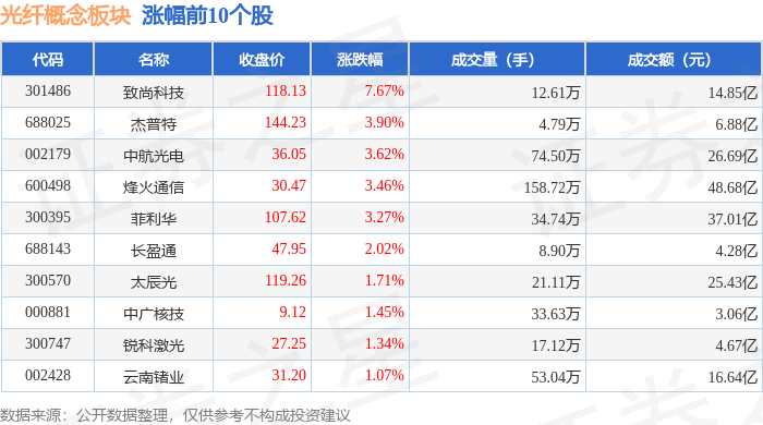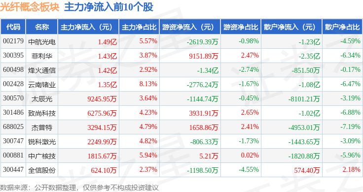 从资金流向上来看,当日光纤概念板块主力资金净流出3.77亿元,游资资金净流入1.55亿元,散户资金净流入2.21亿元。光纤概念板块个股资金流向见下表: