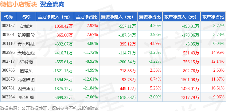 从资金流向上来看,当日微信小店板块主力资金净流出1.06亿元,游资资金净流出1022.08万元,散户资金净流入1.17亿元。微信小店板块个股资金流向见下表: