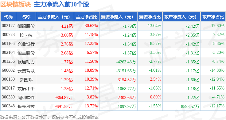 从资金流向上来看,当日区块链板块主力资金净流出27.48亿元,游资资金净流入6.57亿元,散户资金净流入20.9亿元。区块链板块个股资金流向见下表: