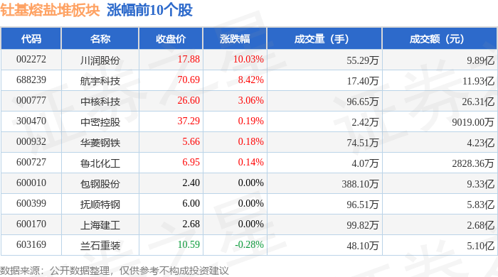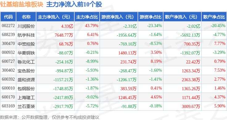 从资金流向上来看,当日钍基熔盐堆板块主力资金净流出9.57亿元,游资资金净流出1.69亿元,散户资金净流入11.26亿元。钍基熔盐堆板块个股资金流向见下表: