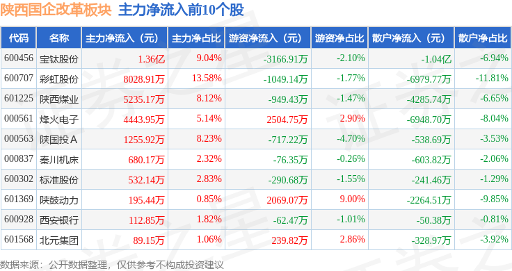 从资金流向上来看,当日陕西国企改革板块主力资金净流出4.9亿元,游资资金净流入6536.84万元,散户资金净流入4.24亿元。陕西国企改革板块个股资金流向见下表: