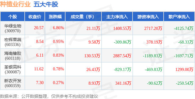 个股表现方面,种植业行业当日领涨股为华绿生物(300970),该股当日报收20.57,上涨6.86%,成交量21.11万,主力资金净流入1408.55万元。宏辉果蔬(603336)以上涨0.95%紧随其后,该股当日成交量9.58万,主力资金净流出309.86万元。除此之外,海南橡胶(601118)、荃银高科(300087)、新农开发(600359)均进入当日牛股之列。具体个股列表见下表: