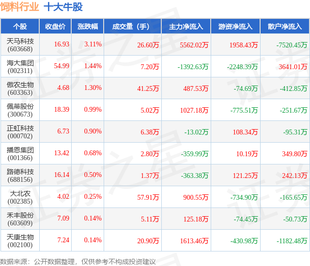 个股表现方面,饲料行业当日领涨股为天马科技(603668),该股当日报收16.93,上涨3.11%,成交量26.6万,主力资金净流入5562.02万元。海大集团(002311)以上涨1.44%紧随其后,该股当日成交量7.2万,主力资金净流出1392.63万元。除此之外,傲农生物(603363)、佩蒂股份(300673)、正虹科技(000702)均进入当日牛股之列。具体个股列表见下表: