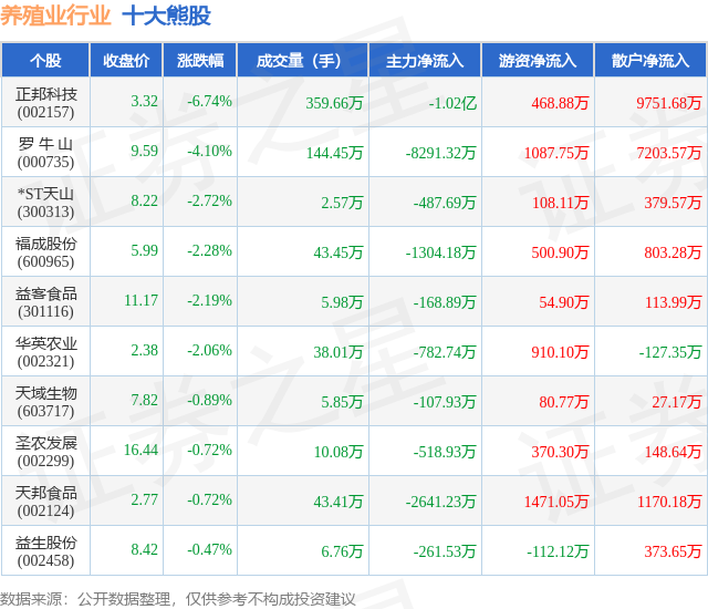 个股表现方面,养殖业行业当日领跌股为正邦科技(002157),该股当日报收3.32,下跌6.74%,成交量359.66万,主力资金净流出1.02亿元。罗 牛 山(000735)以下跌4.1%紧随其后,该股当日成交量144.45万,主力资金净流出8291.32万元。除此之外,*ST天山(300313)、福成股份(600965)、益客食品(301116)均进入当日熊股之列。具体个股列表见下表: