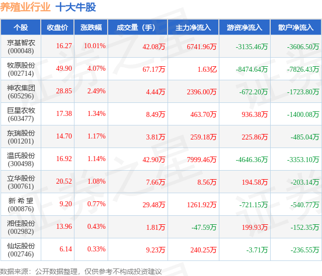 个股表现方面,养殖业行业当日领涨股为京基智农(000048),该股当日报收16.27,上涨10.01%,成交量42.08万,主力资金净流入6741.96万元。牧原股份(002714)以上涨4.07%紧随其后,该股当日成交量67.17万,主力资金净流入1.63亿元。除此之外,神农集团(605296)、巨星农牧(603477)、东瑞股份(001201)均进入当日牛股之列。具体个股列表见下表: