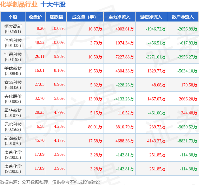个股表现方面,化学制品行业当日领涨股为恒大高新(002591),该股当日报收8.2,上涨10.07%,成交量16.87万,主力资金净流入4003.61万元。信凯科技(001335)以上涨10.0%紧随其后,该股当日成交量3.7万,主力资金净流入1074.34万元。除此之外,汇得科技(603192)、美瑞新材(300848)、富淼科技(688350)均进入当日牛股之列。具体个股列表见下表:
