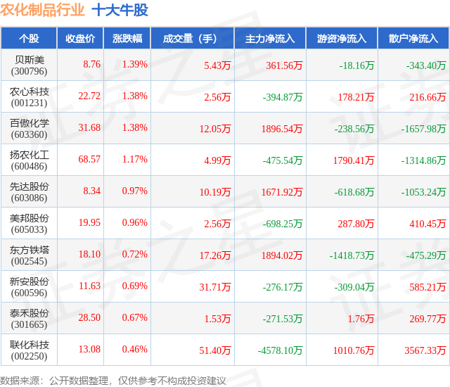 个股表现方面,农化制品行业当日领涨股为贝斯美(300796),该股当日报收8.76,上涨1.39%,成交量5.43万,主力资金净流入361.56万元。农心科技(001231)以上涨1.38%紧随其后,该股当日成交量2.56万,主力资金净流出394.87万元。除此之外,百傲化学(603360)、扬农化工(600486)、先达股份(603086)均进入当日牛股之列。具体个股列表见下表: