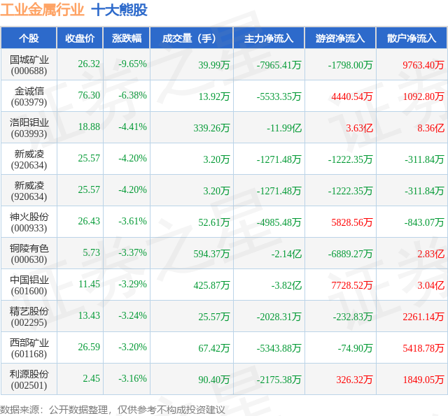 个股表现方面,工业金属行业当日领跌股为国城矿业(000688),该股当日报收26.32,下跌9.65%,成交量39.99万,主力资金净流出7965.41万元。金诚信(603979)以下跌6.38%紧随其后,该股当日成交量13.92万,主力资金净流出5533.35万元。除此之外,洛阳钼业(603993)、新威凌(920634)、新威凌(920634)均进入当日熊股之列。具体个股列表见下表: