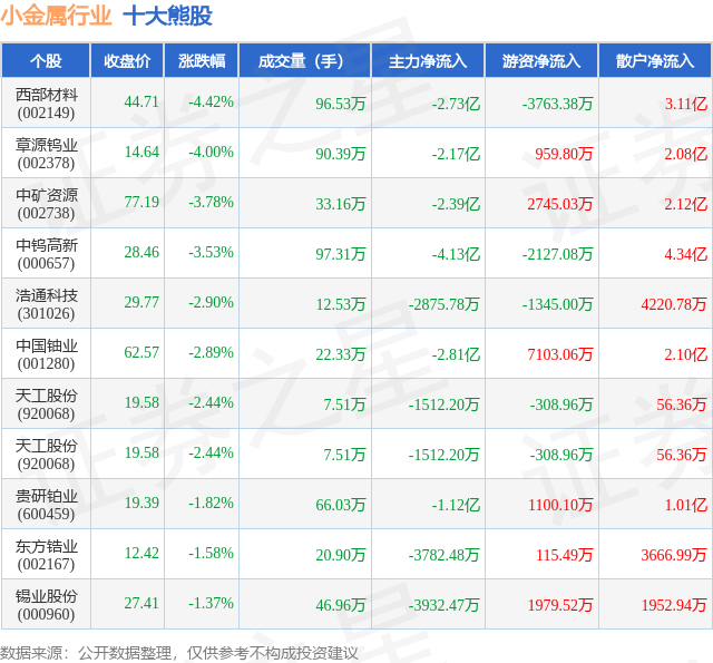 个股表现方面,小金属行业当日领跌股为西部材料(002149),该股当日报收44.71,下跌4.42%,成交量96.53万,主力资金净流出2.73亿元。章源钨业(002378)以下跌4.0%紧随其后,该股当日成交量90.39万,主力资金净流出2.17亿元。除此之外,中矿资源(002738)、中钨高新(000657)、浩通科技(301026)均进入当日熊股之列。具体个股列表见下表: