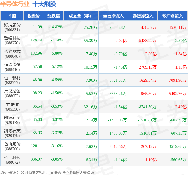 个股表现方面,半导体行业当日领跌股为派瑞股份(300831),该股当日报收11.09,下跌14.82%,成交量25.26万,主力资金净流出2358.48万元。臻镭科技(688270)以下跌7.14%紧随其后,该股当日成交量55.39万,主力资金净流入2.02亿元。除此之外,长光华芯(688048)、恒烁股份(688416)、恒坤新材(688727)均进入当日熊股之列。具体个股列表见下表: