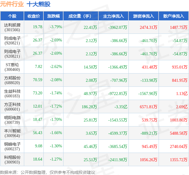 个股表现方面,元件行业当日领跌股为达利凯普(301566),该股当日报收19.78,下跌3.79%,成交量22.41万,主力资金净流出3962.07万元。则成电子(920821)以下跌2.69%紧随其后,该股当日成交量2.12万,主力资金净流出386.66万元。除此之外,则成电子(920821)、ST惠伦(300460)、方邦股份(688020)均进入当日熊股之列。具体个股列表见下表: