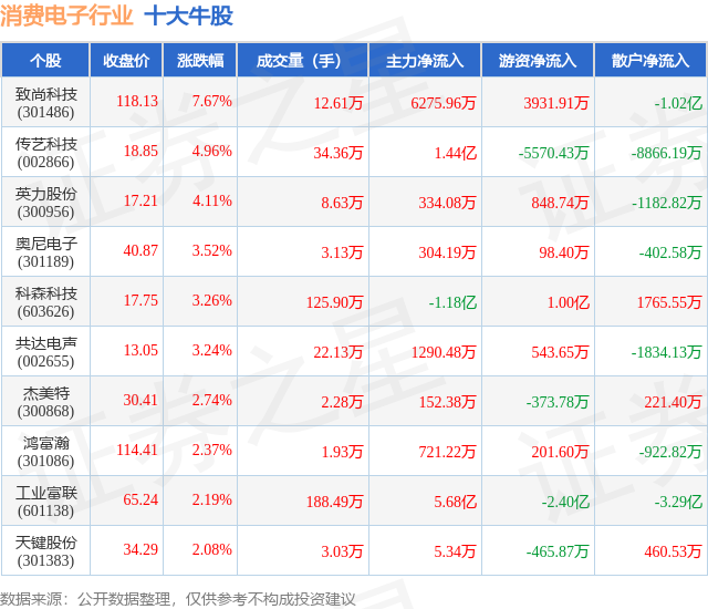 个股表现方面,消费电子行业当日领涨股为致尚科技(301486),该股当日报收118.13,上涨7.67%,成交量12.61万,主力资金净流入6275.96万元。传艺科技(002866)以上涨4.96%紧随其后,该股当日成交量34.36万,主力资金净流入1.44亿元。除此之外,英力股份(300956)、奥尼电子(301189)、科森科技(603626)均进入当日牛股之列。具体个股列表见下表: