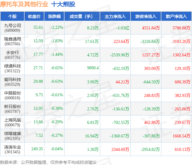 个股表现方面,摩托车及其他行业当日领跌股为九号公司(689009),该股当日报收55.61,下跌2.22%,成交量8.23万,主力资金净流出1.03亿元。隆鑫通用(603766)以下跌1.83%紧随其后,该股当日成交量17.61万,主力资金净流入223.64万元。除此之外,永安行(603776)、绿通科技(301322)、爱玛科技(603529)均进入当日熊股之列。具体个股列表见下表: