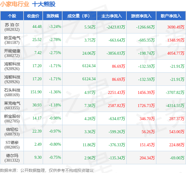 个股表现方面,小家电行业当日领跌股为苏 泊 尔(002032),该股当日报收44.48,下跌3.24%,成交量5.56万,主力资金净流出2423.83万元。欧圣电气(301187)以下跌2.78%紧随其后,该股当日成交量3.75万,主力资金净流出663.64万元。除此之外,开能健康(300272)、鸿智科技(920926)、鸿智科技(920926)均进入当日熊股之列。具体个股列表见下表: