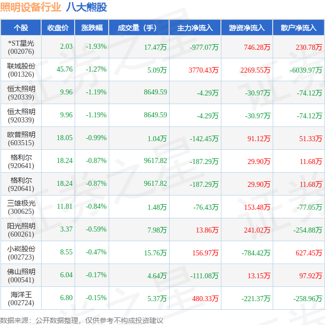个股表现方面,照明设备行业当日领跌股为*ST星光(002076),该股当日报收2.03,下跌1.93%,成交量17.47万,主力资金净流出977.07万元。联域股份(001326)以下跌1.27%紧随其后,该股当日成交量5.09万,主力资金净流入3770.43万元。除此之外,恒太照明(920339)、恒太照明(920339)、欧普照明(603515)均进入当日熊股之列。具体个股列表见下表: