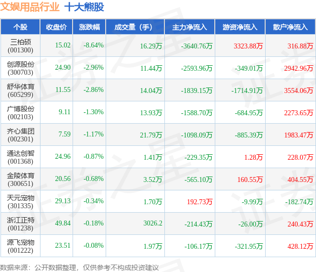个股表现方面,文娱用品行业当日领跌股为三柏硕(001300),该股当日报收15.02,下跌8.64%,成交量16.29万,主力资金净流出3640.76万元。创源股份(300703)以下跌2.96%紧随其后,该股当日成交量11.44万,主力资金净流出2593.96万元。除此之外,舒华体育(605299)、广博股份(002103)、齐心集团(002301)均进入当日熊股之列。具体个股列表见下表: