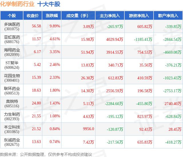 个股表现方面,化学制药行业当日领涨股为多瑞医药(301075),该股当日报收56.58,上涨9.89%,成交量3.09万,主力资金净流出265.97万元。亚虹医药(688176)以上涨4.61%紧随其后,该股当日成交量15.98万,主力资金净流入4029.94万元。除此之外,海翔药业(002099)、ST复华(600624)、花园生物(300401)均进入当日牛股之列。具体个股列表见下表:
