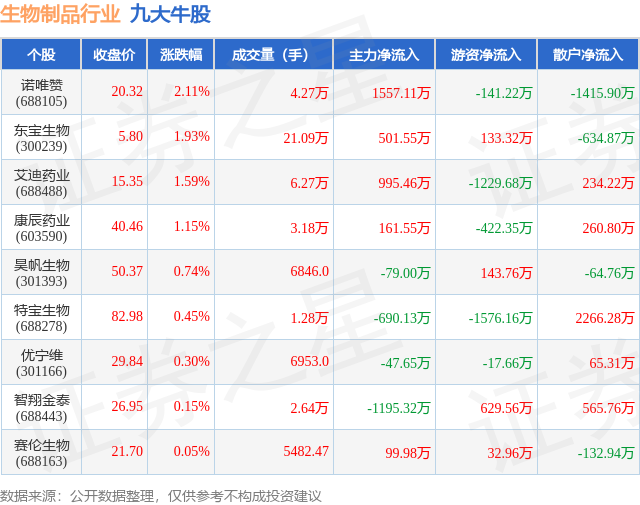 个股表现方面,生物制品行业当日领涨股为诺唯赞(688105),该股当日报收20.32,上涨2.11%,成交量4.27万,主力资金净流入1557.11万元。东宝生物(300239)以上涨1.93%紧随其后,该股当日成交量21.09万,主力资金净流入501.55万元。除此之外,艾迪药业(688488)、康辰药业(603590)、昊帆生物(301393)均进入当日牛股之列。具体个股列表见下表: