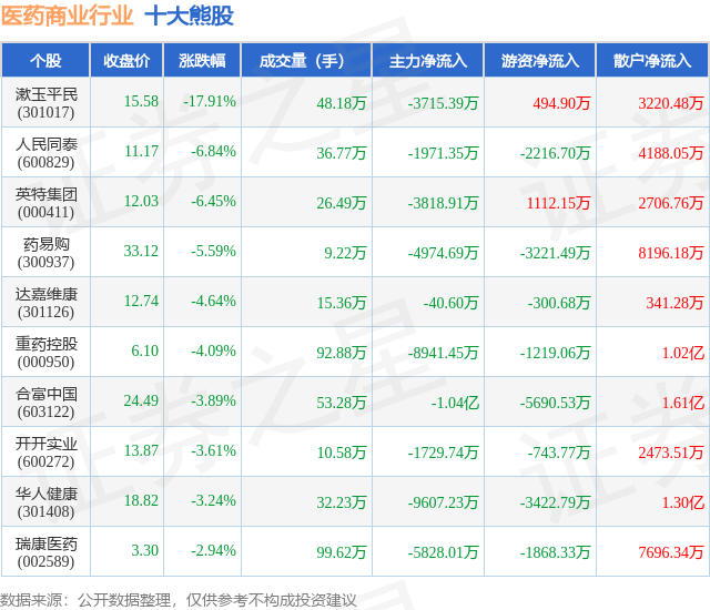 个股表现方面,医药商业行业当日领跌股为漱玉平民(301017),该股当日报收15.58,下跌17.91%,成交量48.18万,主力资金净流出3715.39万元。人民同泰(600829)以下跌6.84%紧随其后,该股当日成交量36.77万,主力资金净流出1971.35万元。除此之外,英特集团(000411)、药易购(300937)、达嘉维康(301126)均进入当日熊股之列。具体个股列表见下表: