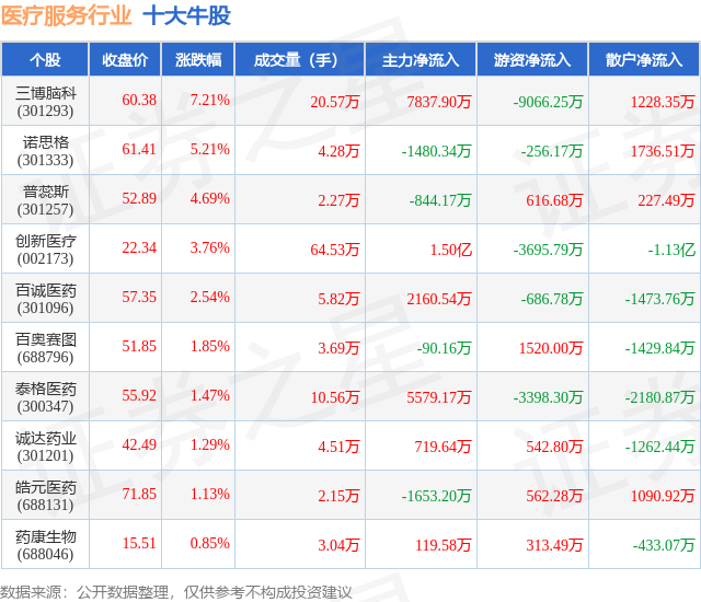 个股表现方面,医疗服务行业当日领涨股为三博脑科(301293),该股当日报收60.38,上涨7.21%,成交量20.57万,主力资金净流入7837.9万元。诺思格(301333)以上涨5.21%紧随其后,该股当日成交量4.28万,主力资金净流出1480.34万元。除此之外,普蕊斯(301257)、创新医疗(002173)、百诚医药(301096)均进入当日牛股之列。具体个股列表见下表: