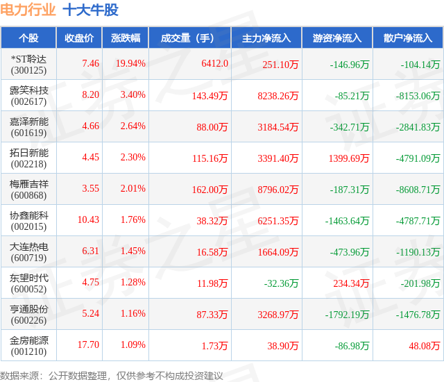 个股表现方面,电力行业当日领涨股为*ST聆达(300125),该股当日报收7.46,上涨19.94%,成交量6412.0,主力资金净流入251.1万元。露笑科技(002617)以上涨3.4%紧随其后,该股当日成交量143.49万,主力资金净流入8238.26万元。除此之外,嘉泽新能(601619)、拓日新能(002218)、梅雁吉祥(600868)均进入当日牛股之列。具体个股列表见下表: