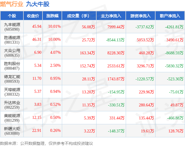 个股表现方面,燃气行业当日领涨股为九丰能源(605090),该股当日报收45.94,上涨10.01%,成交量56.08万,主力资金净流入7999.44万元。胜通能源(001331)以上涨10.0%紧随其后,该股当日成交量25.72万,主力资金净流出8544.13万元。除此之外,大众公用(600635)、胜利股份(000407)、德龙汇能(000593)均进入当日牛股之列。具体个股列表见下表:
