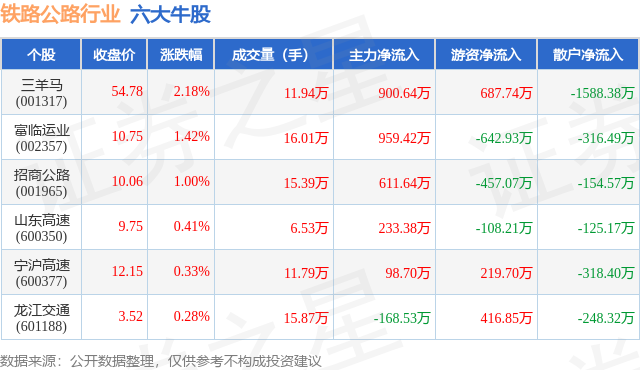 个股表现方面,铁路公路行业当日领涨股为三羊马(001317),该股当日报收54.78,上涨2.18%,成交量11.94万,主力资金净流入900.64万元。富临运业(002357)以上涨1.42%紧随其后,该股当日成交量16.01万,主力资金净流入959.42万元。除此之外,招商公路(001965)、山东高速(600350)、宁沪高速(600377)均进入当日牛股之列。具体个股列表见下表: