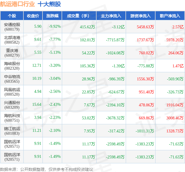 个股表现方面,航运港口行业当日领跌股为安通控股(600179),该股当日报收5.9,下跌9.92%,成交量415.62万,主力资金净流出3.12亿元。北部湾港(000582)以下跌7.77%紧随其后,该股当日成交量102.01万,主力资金净流出7715.87万元。除此之外,重庆港(600279)、海峡股份(002320)、中谷物流(603565)均进入当日熊股之列。具体个股列表见下表: