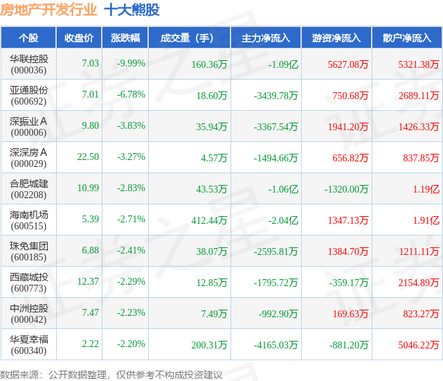 个股表现方面,房地产开发行业当日领跌股为华联控股(000036),该股当日报收7.03,下跌9.99%,成交量160.36万,主力资金净流出1.09亿元。亚通股份(600692)以下跌6.78%紧随其后,该股当日成交量18.6万,主力资金净流出3439.78万元。除此之外,深振业A(000006)、深深房A(000029)、合肥城建(002208)均进入当日熊股之列。具体个股列表见下表: