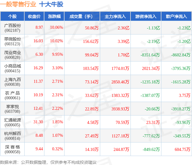 个股表现方面,一般零售行业当日领涨股为广百股份(002187),该股当日报收8.97,上涨10.06%,成交量50.86万,主力资金净流入2.36亿元。翠微股份(603123)以上涨10.02%紧随其后,该股当日成交量156.62万,主力资金净流入3.39亿元。除此之外,茂业商业(600828)、小商品城(600415)、上海九百(600838)均进入当日牛股之列。具体个股列表见下表: