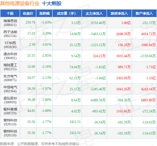 个股表现方面,其他电源设备行业当日领跌股为海博思创(688411),该股当日报收259.79,下跌5.03%,成交量3.15万,主力资金净流出9753.4万元。西子洁能(002534)以下跌3.2%紧随其后,该股当日成交量14.06万,主力资金净流出5463.11万元。除此之外,ST华西(002630)、通合科技(300491)、海陆重工(002255)均进入当日熊股之列。具体个股列表见下表: