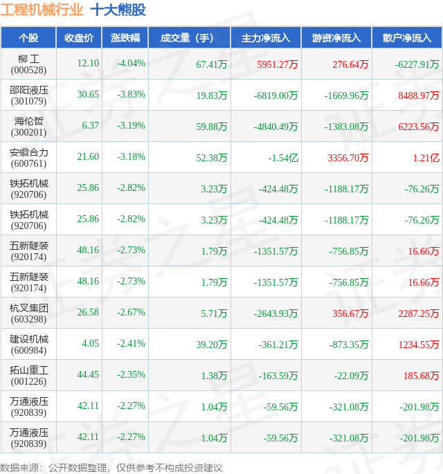 个股表现方面,工程机械行业当日领跌股为柳 工(000528),该股当日报收12.1,下跌4.04%,成交量67.41万,主力资金净流入5951.27万元。邵阳液压(301079)以下跌3.83%紧随其后,该股当日成交量19.83万,主力资金净流出6819.0万元。除此之外,海伦哲(300201)、安徽合力(600761)、铁拓机械(920706)均进入当日熊股之列。具体个股列表见下表: