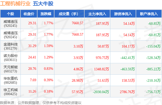 个股表现方面,工程机械行业当日领涨股为威博液压(920245),该股当日报收29.31,上涨1.77%,成交量7661.0,主力资金净流入187.95万元。威博液压(920245)以上涨1.77%紧随其后,该股当日成交量7661.0,主力资金净流入187.95万元。除此之外,金道科技(301279)、诺力股份(603611)、天元智能(603273)均进入当日牛股之列。具体个股列表见下表:
