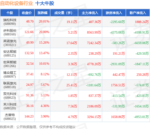 个股表现方面,自动化设备行业当日领涨股为瑞松科技(688090),该股当日报收48.7,上涨20.01%,成交量19.11万,主力资金净流入407.36万元。步科股份(688160)以上涨20.0%紧随其后,该股当日成交量5.21万,主力资金净流入8563.99万元。除此之外,英诺激光(301021)、安达智能(688125)、宏英智能(001266)均进入当日牛股之列。具体个股列表见下表: