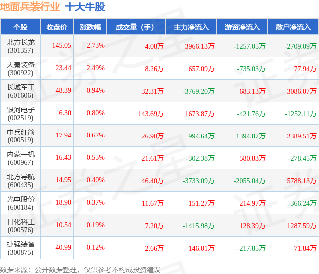 个股表现方面,地面兵装行业当日领涨股为北方长龙(301357),该股当日报收145.05,上涨2.73%,成交量4.08万,主力资金净流入3966.13万元。天秦装备(300922)以上涨2.49%紧随其后,该股当日成交量8.26万,主力资金净流入657.09万元。除此之外,长城军工(601606)、银河电子(002519)、中兵红箭(000519)均进入当日牛股之列。具体个股列表见下表: