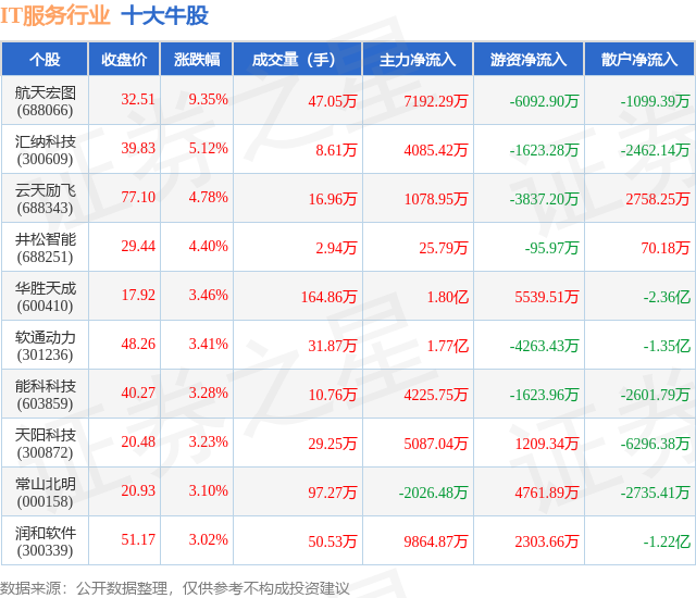 个股表现方面,IT服务行业当日领涨股为航天宏图(688066),该股当日报收32.51,上涨9.35%,成交量47.05万,主力资金净流入7192.29万元。汇纳科技(300609)以上涨5.12%紧随其后,该股当日成交量8.61万,主力资金净流入4085.42万元。除此之外,云天励飞(688343)、井松智能(688251)、华胜天成(600410)均进入当日牛股之列。具体个股列表见下表: