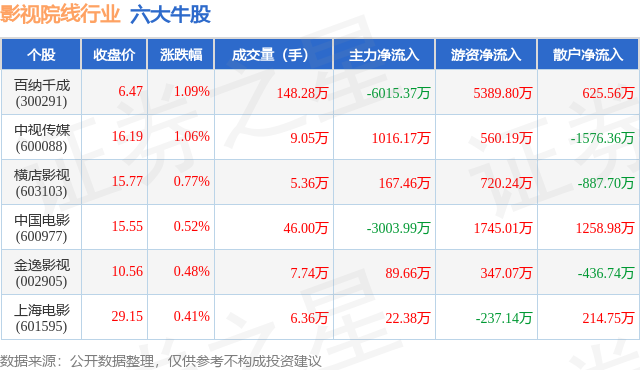 个股表现方面,影视院线行业当日领涨股为百纳千成(300291),该股当日报收6.47,上涨1.09%,成交量148.28万,主力资金净流出6015.37万元。中视传媒(600088)以上涨1.06%紧随其后,该股当日成交量9.05万,主力资金净流入1016.17万元。除此之外,横店影视(603103)、中国电影(600977)、金逸影视(002905)均进入当日牛股之列。具体个股列表见下表: