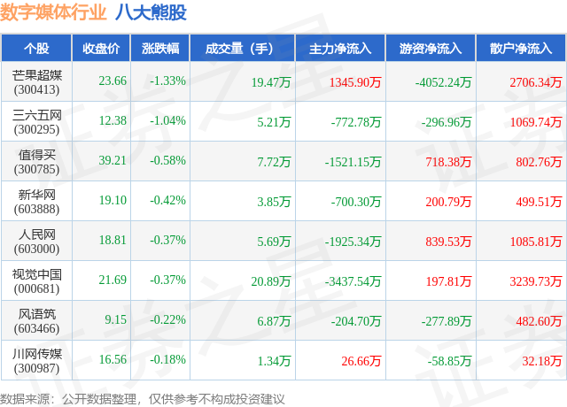 个股表现方面,数字媒体行业当日领跌股为芒果超媒(300413),该股当日报收23.66,下跌1.33%,成交量19.47万,主力资金净流入1345.9万元。三六五网(300295)以下跌1.04%紧随其后,该股当日成交量5.21万,主力资金净流出772.78万元。除此之外,值得买(300785)、新华网(603888)、人民网(603000)均进入当日熊股之列。具体个股列表见下表: