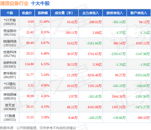 个股表现方面,通信设备行业当日领涨股为*ST天喻(300205),该股当日报收4.69,上涨11.4%,成交量10.42万,主力资金净流入208.02万元。恒宝股份(002104)以上涨8.31%紧随其后,该股当日成交量189.11万,主力资金净流入2.68亿元。除此之外,锐捷网络(301165)、世嘉科技(002796)、剑桥科技(603083)均进入当日牛股之列。具体个股列表见下表: