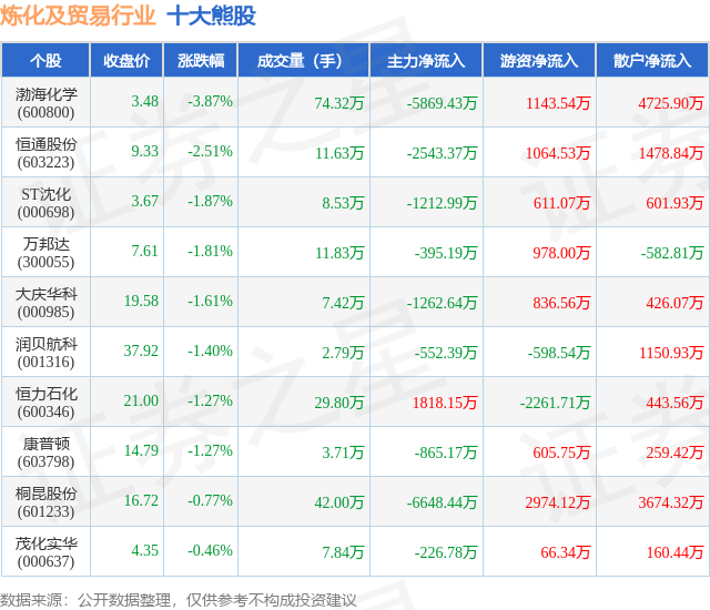 个股表现方面,炼化及贸易行业当日领跌股为渤海化学(600800),该股当日报收3.48,下跌3.87%,成交量74.32万,主力资金净流出5869.43万元。恒通股份(603223)以下跌2.51%紧随其后,该股当日成交量11.63万,主力资金净流出2543.37万元。除此之外,ST沈化(000698)、万邦达(300055)、大庆华科(000985)均进入当日熊股之列。具体个股列表见下表: