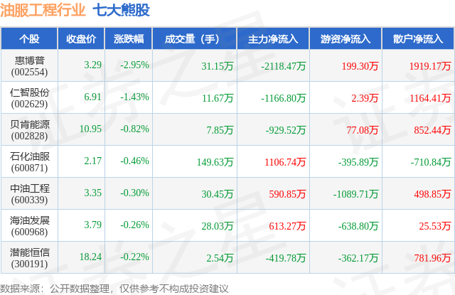 个股表现方面,油服工程行业当日领跌股为惠博普(002554),该股当日报收3.29,下跌2.95%,成交量31.15万,主力资金净流出2118.47万元。仁智股份(002629)以下跌1.43%紧随其后,该股当日成交量11.67万,主力资金净流出1166.8万元。除此之外,贝肯能源(002828)、石化油服(600871)、中油工程(600339)均进入当日熊股之列。具体个股列表见下表: