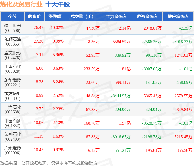 个股表现方面,炼化及贸易行业当日领涨股为统一股份(600506),该股当日报收26.47,上涨10.02%,成交量47.3万,主力资金净流入2.14亿元。和顺石油(603353)以上涨9.99%紧随其后,该股当日成交量8.36万,主力资金净流入5584.59万元。除此之外,宝莫股份(002476)、中国石化(600028)、东华能源(002221)均进入当日牛股之列。具体个股列表见下表: